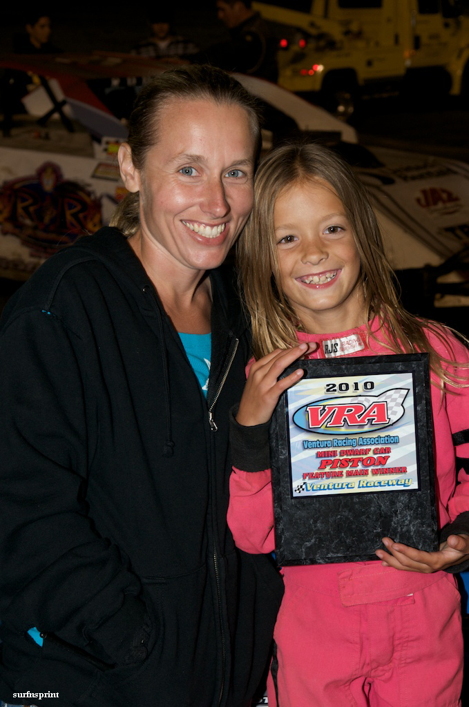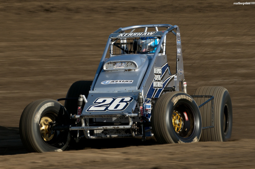 The Ventura Racing Association Senior Sprint division is undergoing a sea change. Rabid membership combined with state of the art efforts have transformed it from the “old folks” of the VRA to a prestigious and hard fought series. Leading the charge is the Kershaw juggernaut; a combination of hard core racer and sponsor Rob Kershaw, the remerging high performance of Gary “the Legend” Howard and the talented wrench of crew chief Matt Dale. These three individuals have combined at Ventura Raceway to vault the prominence of VRA Senior Sprint car racing and will eventually (as Rob’s kids grow) come to affect Southern California sprint cars in general. They are counterbalanced and counterattacked by the committed Fast Undercar contingent of Bruce Douglas, Victor Davis and the whole Steve Watts Bad Wrench Crew, maybe the most talented group of car builders and set up artists ever assembled at Ventura. If you want to go fast, you call 1-800 Biggie. Senior regulars Roy Miller Freightlines, Bach Construction and Bob Alderman all throw fuel on the fire. Then there are an incredible slew of fanatical newcomers including Cliff Warren, Russell Deblauw and Chris Meredith pushing their way to the front. Ventura sprint fans are feasting on a greasy BBQ of investment, innovation and hi-test beer. Last weekend’s main course finished with the surf and turf of Kershaw and Howard, followed across the line by Bruce Douglas, Cliff Warren and Victor Davis. Powerful stuff going down. We’re just digging it in the stands.