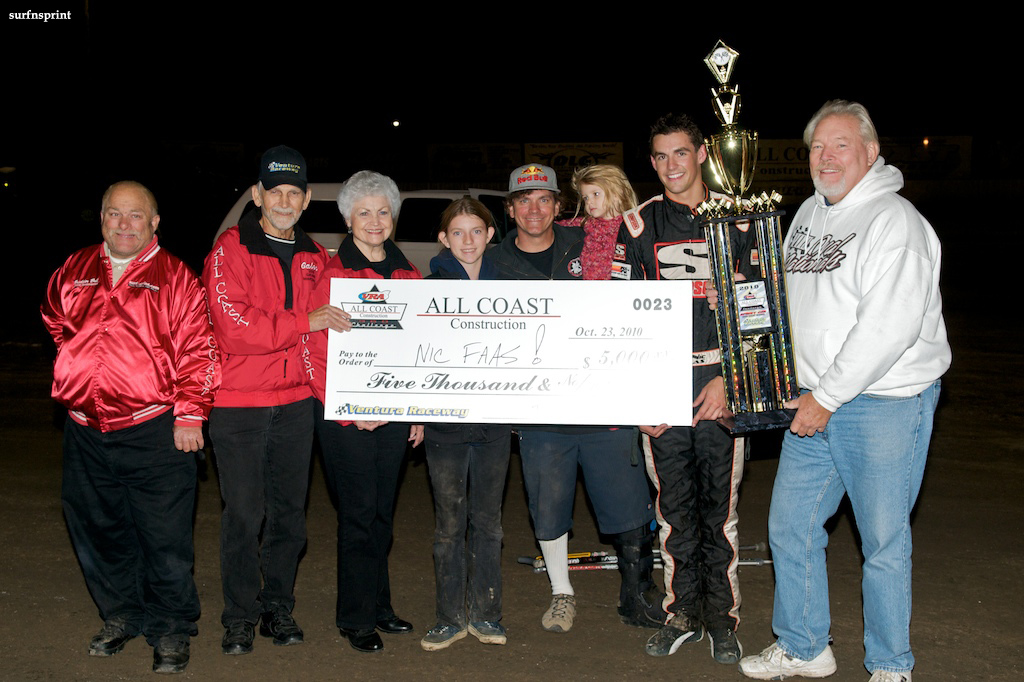 The storm passed as quickly as it gathered. Every race has a little controversy and this one had plenty. The scorers were overwhelmed, it’s now Wednesday, they are studying the video and we are still waiting for the final accounting. The hard charger will emerge;I thought it was Donnie Gansen. I believe Jim has placed an order for transponders and one-way radios! I don’t care about any of that, I saw Nic Faas tear that one out of Jonathan Henry’s hands. All my friends made at least gas money and everybody in the stands was high five. Naylor and his dedicated crew knock it out of the park week after week. We’re not worthy. I crawled back to the hotel at midnight, hooked up with Darland over a beer and we talked about family and remodeling farmhouses. I like that Midwest timber; straight, level and true. Thanks Jon and Dave, you have carte blanch next year. Thanks to Biggie and Tommy for pushing the edge of that Ventura envelope. Jackslash, the authorities are looking for you. Your fingerprints were everywhere at the scene of the crime. And the All Coast Challenge points battle for five grand? Keith Ford came up to me in the winner’s circle and asked “What up? I think we won it?” I looked up in the tower and saw the tense circle and scratching heads. “I think they’re trying to figure it out, you’ll be the first to know” I told him. He thanked me for everything and took off. I went into the tower and after a while we determined it was Ford. I grabbed the oversized check and trophy and took off in the dark for the Ford hauler. My young daughter and niece were carrying opposite ends of the five-foot high trophy. The Ford entourage was all packed up and getting ready to split. They saw this giant check and trophy come walking out of the dark and started cheering. It was classic, maybe the nicest moment I experienced all year. Josh Ford Racing typifies the hard-core Ventura racer, determined, talented and professional in every manner. I appreciate their dedication to Ventura and applaud their victory. Sprint car drivers shred the ordinary and leave us mortal fans breathless and inspired. It happens so fast, I can barely perceive it. It’s after the race, beer in hand, that I relish the nuance, details and irony you find in the backside stories.