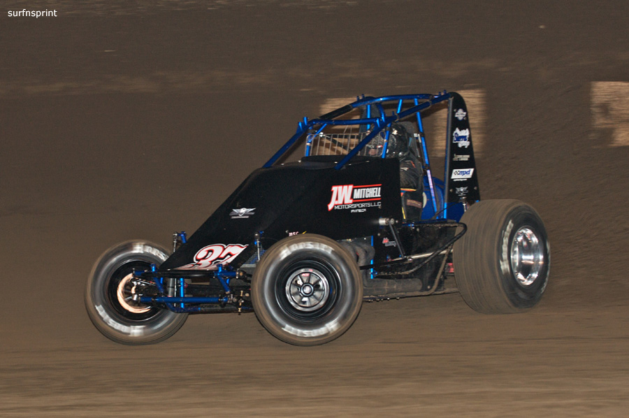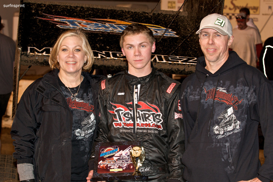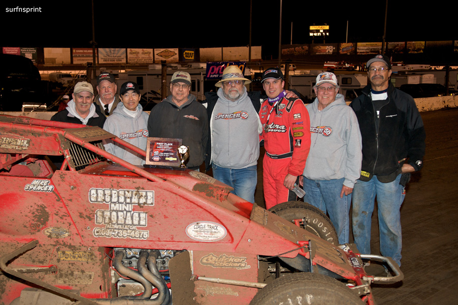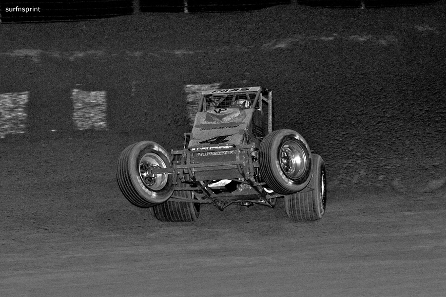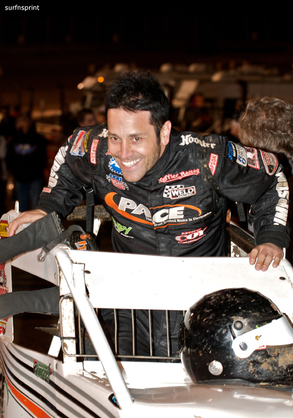 These two guys deserve each other. I mean really. They belong together. Like peanut butter and jelly knocked back with a whiskey, salt flakes on dark chocolate. I don’t want to say there is a rivalry; it’s more like a holy war. These guys love each other, but just barely. Every time you put these two together, that high cold Mid West air collides with the warm moist ocean and bring on the Weather Channel. It blows your hair back and just shreds your admission ticket. Yeah, I’m talking about the Beatles and the Stones, Frick and Frack, Ducky and Damnation, Lucifer and the Archangel of Golden State sprint car racing. And it’s not just the Demon and the Spence; all of those fantastic nut jobs out there delivered the bomb Saturday night. When you witness that snarling, biting and clawing ball of racers roll through the Perris corners and brawl down the backstretch, it just takes your breath away. Count your blessings.