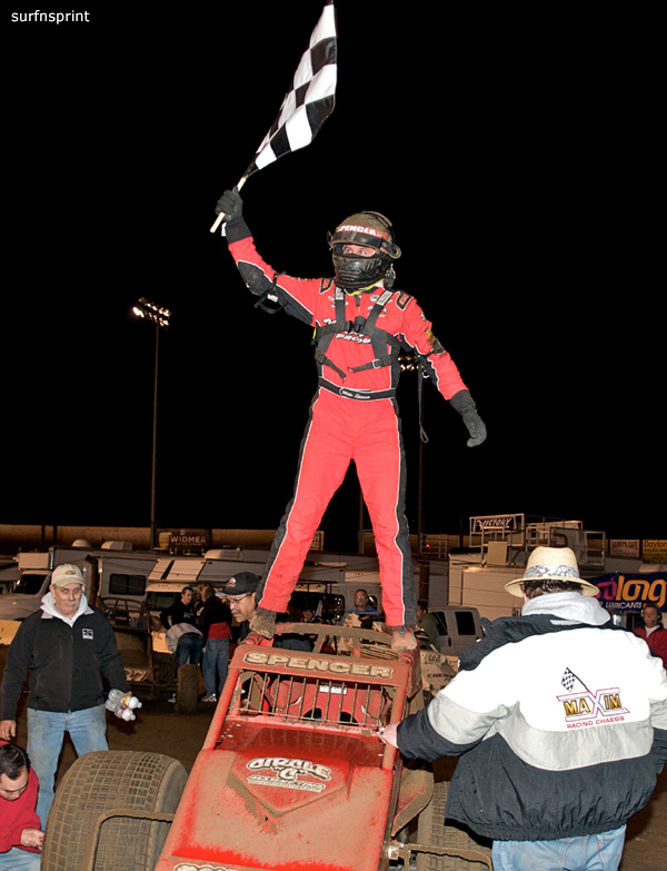 Heartfelt missing man formation for Wilda Kindoll, Chet Gardner and Robert Davidson. Blake Miller on the pole and Damion Gardner in a Dwight Cheney chariot to the outside. Miller gets on the gas and gets in the front of the Demon. His car is tight and lifting in the corners. It’s Miller, Gardner, Matt Mitchell, David Cardey and looky here, Nic Faas. Smoking fast, that familiar roar of 410’s soothes the soul. In a world full of antibacterial crap lotion, it’s nice to feel the grease. We get a mess in turn four that flips Cody Williams and we are red. Double wide restart and once again Miller lifts to the occasion. Gardner is pushing hard but hits the berm in four and that throws him off. Matt Mitchell in the third spot is applying pressure. It’s Miller, Gardner, Mitchell, Faas and Cardey, but further back you can see Mike Spencer on the move from the fourth row. He clears Cardey and sets after fourth place Faas. The Demon is bedeviling Miller, but Miller is perfect and holding. They drag down the backstretch. Coming out of four, they are in contention, Damion hits the rocket switch and he’s gone. Brilliant Matt Mitchell gets stuffed behind a rookie and falls back. Spencer goes around Faas and this thing is starting to take shape. Damion Gardner is arguably the hottest sprint car driver in the nation and here comes great West Coast hope Mike Spencer who is starting to reel him in. Improbable on the face of it but thrilling in the reality. Watching Gardner control the lead while dodging the backmarkers, you just love the beauty of it. Spencer is grinding away at second place Miller, he catches him in turn two and gets squeezed between Miller and Faas. Spencer spits the hook and just launches down the backstretch. Ronnie Gardner spins and they put Spencer back on the yellow. Green and the Demon books it. Spencer finally bests Miller and here we go. Outstanding racing between Miller and Faas, Matt Mitchell in fifth, Danny Sheridan trying to chase him down. It’s Gardner, Spencer, Miller and here comes Mitchell again, determined and tenacious. But up front, it’s unbelievable cat and mouse action, maybe more like a cheetah and a gazelle match. Gardner and Spencer are wicked through the traffic and exploding expectations. Gardener bobbles out of turn one and Spencer snatches the lead away. There is a yellow for Fast Time Greg Alexander and they put Spencer back. Possibilities snap like a twig. Seventeen laps are completed. Green again and Gardner, still smarting from his mistake, is hammer down and the Dwight Cheney #42 is responding with heart. Mike Spencer is a man on a mission; Damion Gardner is his nemesis. I believe Damion gives Spencer his greatest motivation for racing, a worthy opponent. The uber ability level, the common experience with cars and crews, the many critical matches they have fought over the years. Mike Spencer is a racing carnivore and he smells meat. We are not just watching a race; we are watching two of the greatest drivers in the country having another personal slugfest. Lap after lap drama assaults the fans and they are back on their heels. Matt Mitchell keeps saying “excuse me, I am here” and the three are high speed drifting through the turns. Mike keeps going to the bottom trying to get a nose under Damion, the Demon keeps responding with honed defensive skills and speed for speed on the straights. Traffic is everywhere and the white flag flies. It looks hopeless for Spence as they come through the first two turns. Damion keeps the speed down the back, Spencer is going high and not holding anything back in three. Suddenly a back marker appears on the bottom motoring around turn four. Damion sees him as he commits to the bottom, tries to adjust but the race is lost as he makes the most incredibly miniscule speed adjustment coming into four. Spencer is again flawless as he picks up the highline speed and catapults past Damion in the short distance from four to the flag. Scott shouts at the crowd “what do you think of that?” and gets a huge roar of approval. I am running down the steps from the roof of the infield snack stand and Ron Chaffin is right behind me. He is making a lot of noise and I would have to describe him as, uh..…pleased. As powhaushb wrote on the message board later “This race is what the PAS is and Sprint Car racing is all about”. I don’t think I could have said it better, powshaushb.