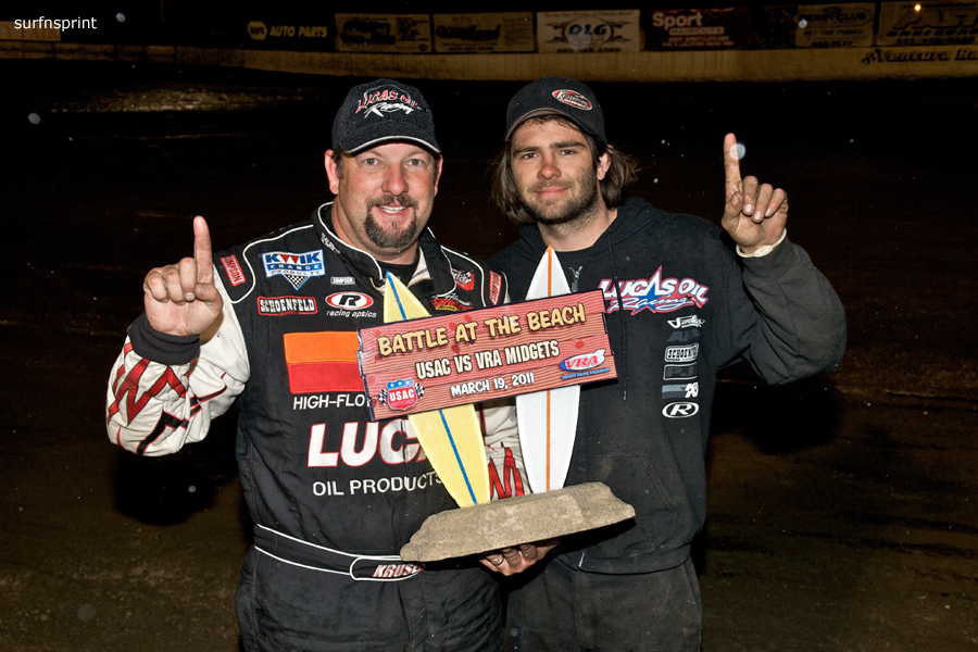 Don’t tempt the gods they say. Tempt them? We kicked sand in their face. Flipped ‘em the bird. Dropped our shorts, mooned and shook it. Jim Naylor woke up on the dreariest morning since gray was discovered, looked up at the black sky and whispered, “Race is on!” Drivers were on the move from Indiana to Ojai and all points in-between. Forget the All Coast Challenge, its fine and hanging tough but that wasn’t good enough. This knucklehead went out and dreamed up a new midget sanction, double-dared USAC to a race and suddenly it was raining midgets. Battle at the Beach or some corny thing, but who cares, it was brilliant. Not one main event but two blistering showdowns, sprints and midgets, teetering on the edge of weather and reason. You really had to be a lunatic to think it would actually go off. You were checked at the gate and only the most hardcore fans were allowed in the stands. They got membership points with heat after heat after heat of track perfection and driving inspiration. We’re talking quality, no off-brand drivers here. Kruseman, Spencer, Josett, Stanbrough, Swanson, Henry, Rutherford, Taylor; even the great Derek Buckley strolled down from the hills and showed them how it’s done. Things are strange, people are looking for work and radiation floats on the breeze. In the darkest of times, on the nastiest day, in the final waning desperate moments Naylor and his gang of staff, drivers and fans set it up and knocked it down. And when we were done, the skies split open and for twenty-four hours screamed foul.