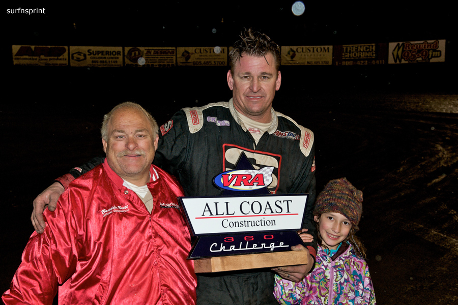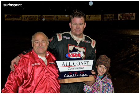 Troy Rutherford doesn’t take anything for granted. Tireless preparation wins races and when he rolled into Seaside Park Saturday, I don’t think he had a shred of doubt he was going to win. But when you have the current VRA Champion, the current USAC-CRA Champion and the King of Indiana all on the track, it’s the fans who win. Rain was misting, retreating and then pelting again as they pushed off that main. Jon Stanbrough had been very ill all evening but gave it a go from the seventh row. Mike Spencer challenged strongly from the second row, but faded to sixth when something happened to that car and he started going backwards. But it was Derek “the Animal” Buckley that delivered the drama, channeling the attitude and moves of the late, great Hockett. Rim riding on the walls, he repeatedly stalked and challenged race leader Rutherford. That track was greasing up as the rain got serious and Buckley couldn’t quite get the traction he needed to pass for the win. Throw in Greg Taylor up front also and you pretty much had the whole Ojai Mafia digging for the podium. But Hammering Henry crashed that party too, getting around Greg Taylor for third and stealing the last of the cash. Taylor fourth, Kruseman fifth. Brent Camarillo was hard charger; he was in everybody’s face all night! The All Coast Challenge rolls on, collecting bits and pieces of racing lore each year.