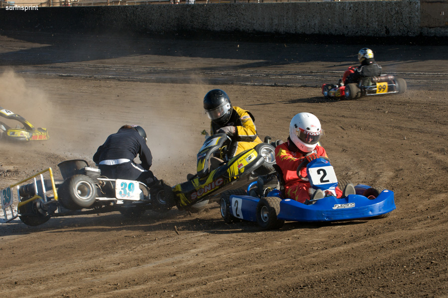 Senior Sprints are having a Jimmy Johnson year. Rob Kershaw has brought the family and is showing the boys how it’s done. Bill Badger suffered a nasty flip in the main, but walked off under his own power. Hope you’re feeling better, Bill. Kershaw took the bottom groove and never gave anybody a chance. Bruce Douglas gave it his all, he did everything but crash Kershaw trying to get around him. Bruce, who excels on the bottom, finally took the high line and tried to pass by going around him. He doesn’t know how close he came. Bruce just needed to time the lapped cars a little bit better and he would have made the pass Rob got stuffed by traffic. I like both these guys, it unimportant to me who won; but it was significant to me that Bruce gave it everything, Kershaw kept his cool and man that was a show! On the final lap in frustration, Bruce bumped the back of Rob’s car coming into turn three. Coming out of four, Rob hung his finger out the window and brother we were cracking up. Check it out on Loudpedal Video.