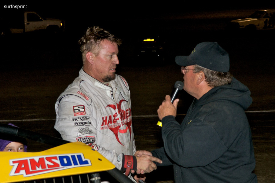 What can I say about the VRA Sprint Car Main Event? Unbelievable speed, control, anger, exhilaration and attitude. Naylor’s racing factory gave the four front-runners an invitation to rip. Brent Camarillo took the front row and blistered my expectations for about seventeen laps. The cat and mouse with him and Troy was about as good as it gets. Troy was on Brent’s tail like a blowtorch. The guts and the talent shown by Brent were immeasurable as he held off that unrelenting attack. He got a little sloppy on a restart, left a little too much room, tried to slam it but the wolf was at the door. He was black flagged for loss of a nerf bar. I’m down with this kid all the way. Jimmy Crawford comes out to this track on frequent occasion and constantly threatens to steal the show. When Brent and Troy were slugging it out on the bottom, the astute Neutron drove around them and dominated from lap eighteen to twenty-seven. In my never humble opinion, former VRA Champion Crawford is just about the most under rated driver at Ventura. Never flashy, always in the middle of the fight, much like Steve Conrad. Driving from the inside sixth row, Greg Taylor is a solid rock. Saw him before the race and he was as relaxed as ever. Always doing the talking with his driving, he was the hard charger finishing second but got to the front too late for the showdown. We are all still waiting for that one big Taylor/Rutherford throw down. And then another! And speaking of Troy, what a drive he had! What a convoluted strangeness to be racing against people’s perception of you. The defending VRA Sprint Car Champion felt he had to win this race for his family and fans. I was tuned into Clive and Garrett and the rest of his hard working crew. In any case, the speed was insane and his battle with Brent was intense. It took twenty-seven laps for Rutherford to wrest control away from the determined Camarillo and Crawford, but with skill, sweat and perseverance, he took it in final laps and flat out won his personal battle. The post race winner’s circle was awkward, to say the least, you can’t just put a band-aid on it. But I was encouraged to hear Troy tell the Truex interview “he doesn’t want to look back, he wants to look forward”. That will win the race against perception.