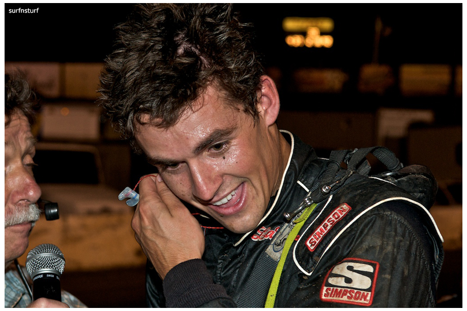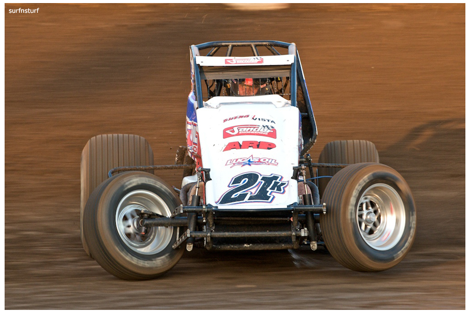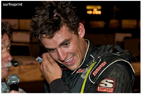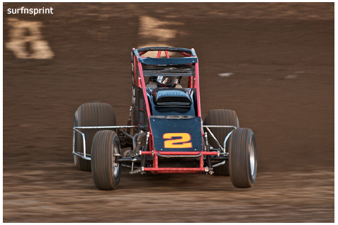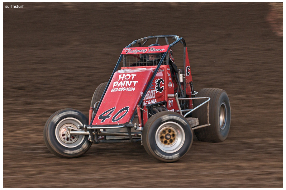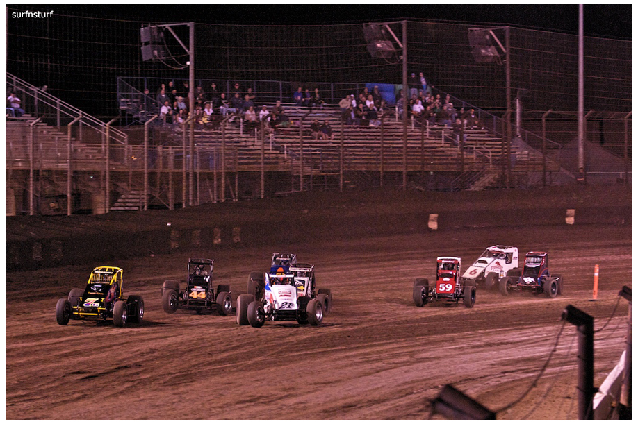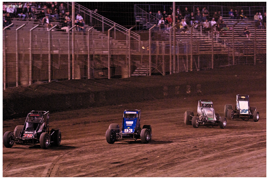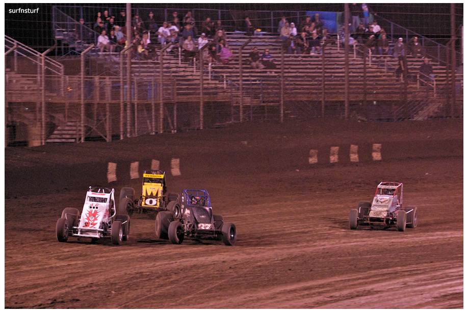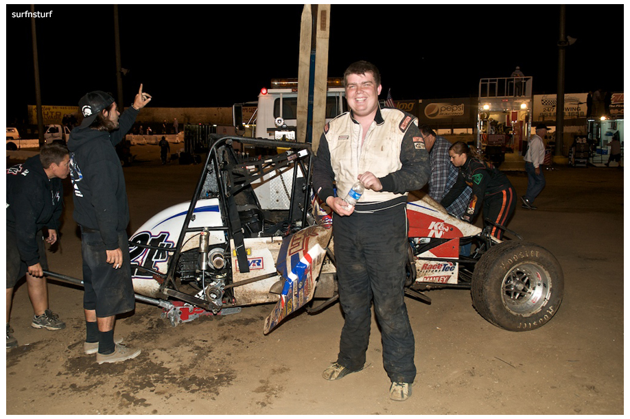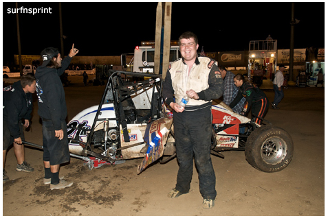 Perris Main Event: The high performance and low drama Greg Bragg on the pole. Gets a good run on the green but the tower calls them back for a restart. They throw the flag again and front row David Cardey matches Bragg down the front. Cardey gets under Bragg in turn three, Austin Williams gets under Cardey, Nic Faas clears Rip and Bragg regains the lead launching out of four. It’s Bragg, Austin Williams, Cardey and Faas. Rip is fifth with Danny Sheridan, Rickie Gaunt and Mike Spencer pounding the back door! Rip takes that fifth and trades up with David Cardey for fourth. Looks like Dynamite missed the set up. Sheridan in front of the Ripper and here comes Matt Mitchell into view getting past Spencer for seventh. Bragg is out front but two of the hottest kids in town, Austin and Nic, are biting at his heels. Those kids bang wheels coming out of turn two and we all flash on the fisticuffs flurry in Calistoga. This is not a bad thing; many great rivalries have taken seed in shallower dirt than this. Bragg refuses to relinquish and we are yellow when Bobby Bender comes to a stop on track, they push him to the work area. The track is ridiculously fast. Bragg is perfect, fast and first, but its clear Williams and Faas are headed to the front. The line up is Bragg, Williams, Faas, Sheridan, Ripper, Super Rickie, Mitchell and the Spence. The restart off the cone is so fast it just fills you with pride and wonder. Spencer immediately clears Mitchell back in seventh and Faas takes second away from Austin. There is a cluster of braking in turn four and everything gets kinda shaky. Faas almost parks it in turn two but redeems himself with an insanely fast pass in turn three for the lead (“never lifted” Holt tells me later). I remember Mike Arthur telling me before the race “Faas is the car”. Sheridan and Mitchell had capitalized on the cluster and its now Faas, Bragg, Williams, Sheridan, Mitchell, Gardner (in a freshened engine), Gaunt and Spencer. Looking back to the front, Faas has disappeared into the future and the rest of them are left to race each other. Heavy traffic as Austin takes second over Bragg and here comes Mitchell. Faas is a full one-quarter track out ahead. Matt Mitchell, in an increasingly off-hand manner, is now second and slicing through the markers looking for clues. But Faas is now lapping the back half of the top ten and those are all names you would recognize. Jay Waugh from New Zealand is in the Kruseman 21K and he wads it up on the front straightaway (broken axle, not really his fault), we are red. The tower calls for them all to heel, they line them up without the lappers. Didn’t matter. Despite Matt Mitchell inspired driving and Austin Williams’ ascending star, Alexander Racing put a car on the track and driver behind the wheel that just destroyed the competition. Nic Faas owned the night and the cowboy ghost rides again. Top five finish: Faas (can win at will), Mitchell (hitting his stride coming into the Nationals), Williams (this year’s best development), Sheridan (the best of Sheridan is back) and Bragg (rock steady).