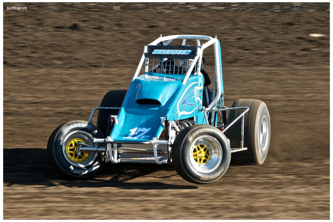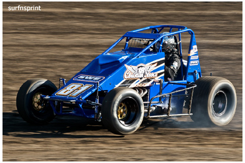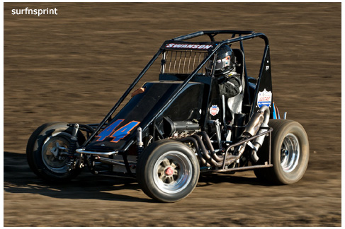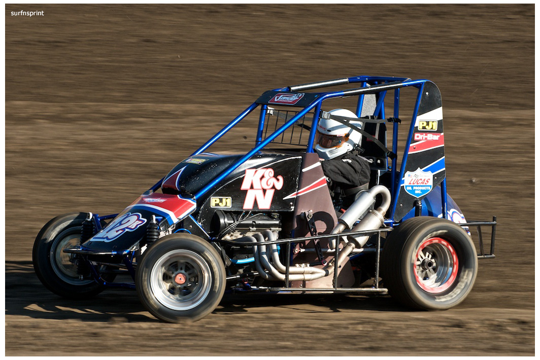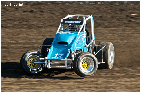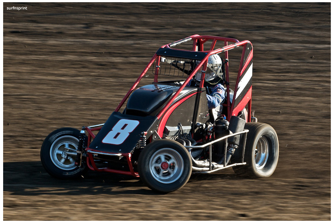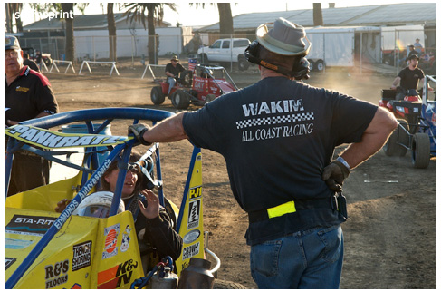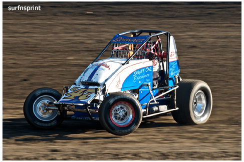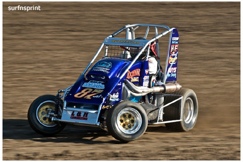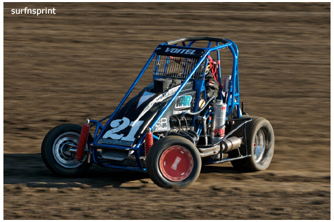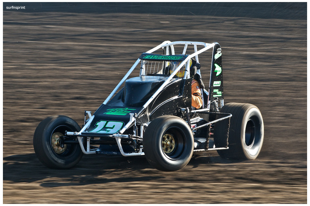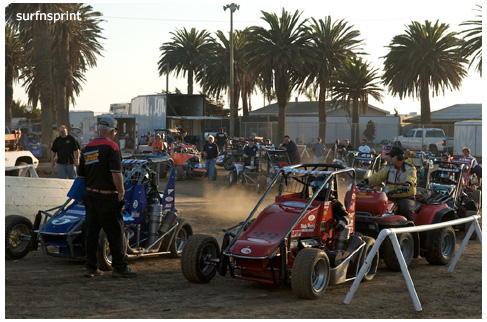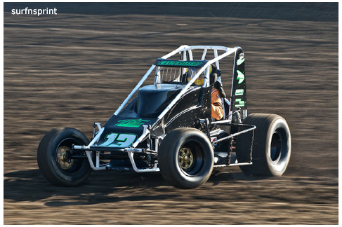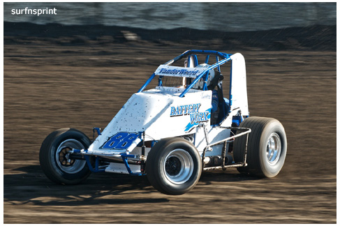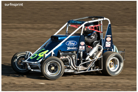 Line up is Kruseman, Taylor, Camarillo and Faria. Both Jace and Richard VanderWeerd are still coming, Jonathan Henry and Tom Hendricks are also there. Hendricks has been on the gas lately but now comes into turn four too hard and flips. We are yellow. Green flag, the Kruser and Taylor resume their high speed debate. Sheer amazing beauty and speed as these two veterans show off Ventura’s seductive closeness. Greg tries to set up for some tentative slides, but Kruseman is not even interested. With twelve laps complete, Jace spins in turn one and we are yellow for the third time. Still no change in the line up and we are green. More Kruseman schooling as Taylor is now being challenged by Brian Camarillo off the restart. Likewise Faria is battling with USAC West Coast Champion Richard VanderWeerd. And people say these guys won’t travel! Now there is traffic and Brian tries to slide Taylor coming through three and four. But Taylor has bigger problems coming at him. Going through turn four, Kruseman makes contact with Ed Schwarz. Kruseman clears but Schwarz starts fishtailing down the front and Taylor catches a wheel trying to clear him. He doesn’t flip but there is damage and he is spun and stopped. The party was just getting good and Taylor is sent to the work area. Ten thousand fun tickets are cancelled but he is still in the points race for 5K if he gets back out and stays ahead of Steve Conrad and Brian Camarillo. He refires and joins the restart at the back.
