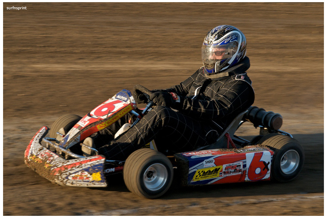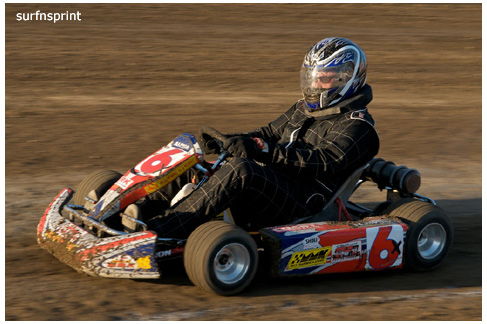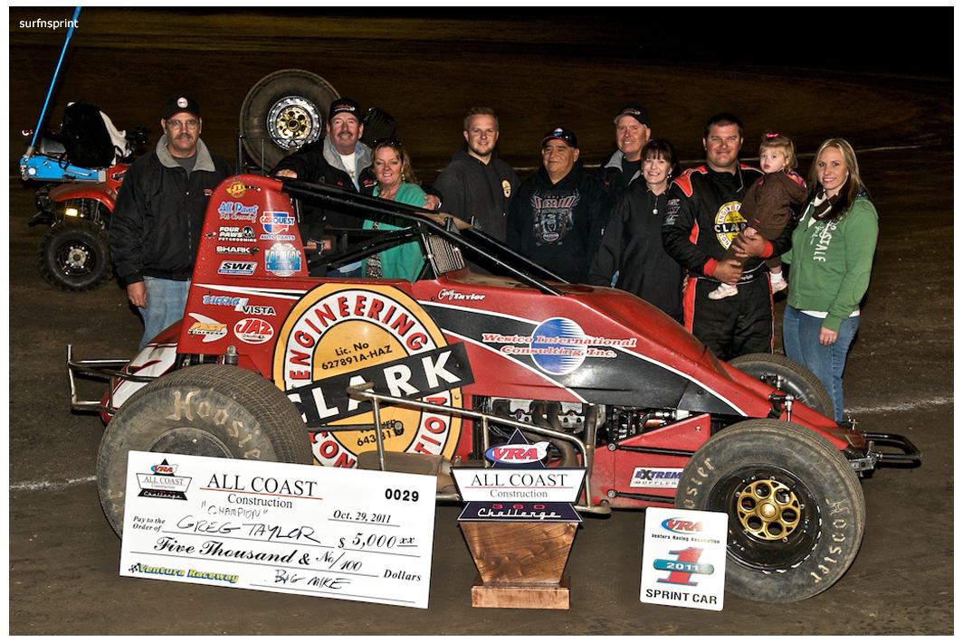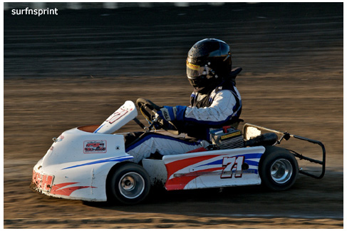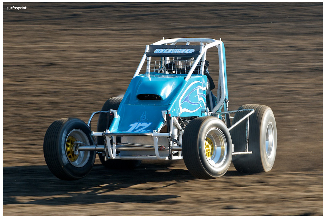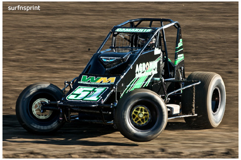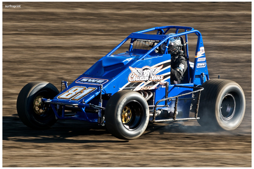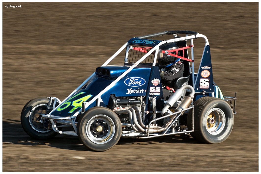 Line up is Kruseman, Taylor, Camarillo and Faria. Both Jace and Richard VanderWeerd are still coming, Jonathan Henry and Tom Hendricks are also there. Hendricks has been on the gas lately but now comes into turn four too hard and flips. We are yellow. Green flag, the Kruser and Taylor resume their high speed debate. Sheer amazing beauty and speed as these two veterans show off Ventura’s seductive closeness. Greg tries to set up for some tentative slides, but Kruseman is not even interested. With twelve laps complete, Jace spins in turn one and we are yellow for the third time. Still no change in the line up and we are green. More Kruseman schooling as Taylor is now being challenged by Brian Camarillo off the restart. Likewise Faria is battling with USAC West Coast Champion Richard VanderWeerd. And people say these guys won’t travel! Now there is traffic and Brian tries to slide Taylor coming through three and four. But Taylor has bigger problems coming at him. Going through turn four, Kruseman makes contact with Ed Schwarz. Kruseman clears but Schwarz starts fishtailing down the front and Taylor catches a wheel trying to clear him. He doesn’t flip but there is damage and he is spun and stopped. The party was just getting good and Taylor is sent to the work area. Ten thousand fun tickets are cancelled but he is still in the points race for 5K if he gets back out and stays ahead of Steve Conrad and Brian Camarillo. He refires and joins the restart at the back.