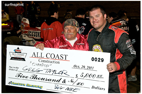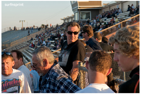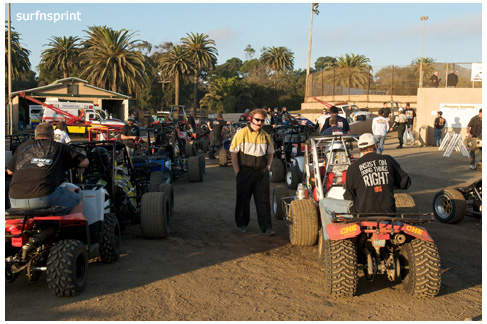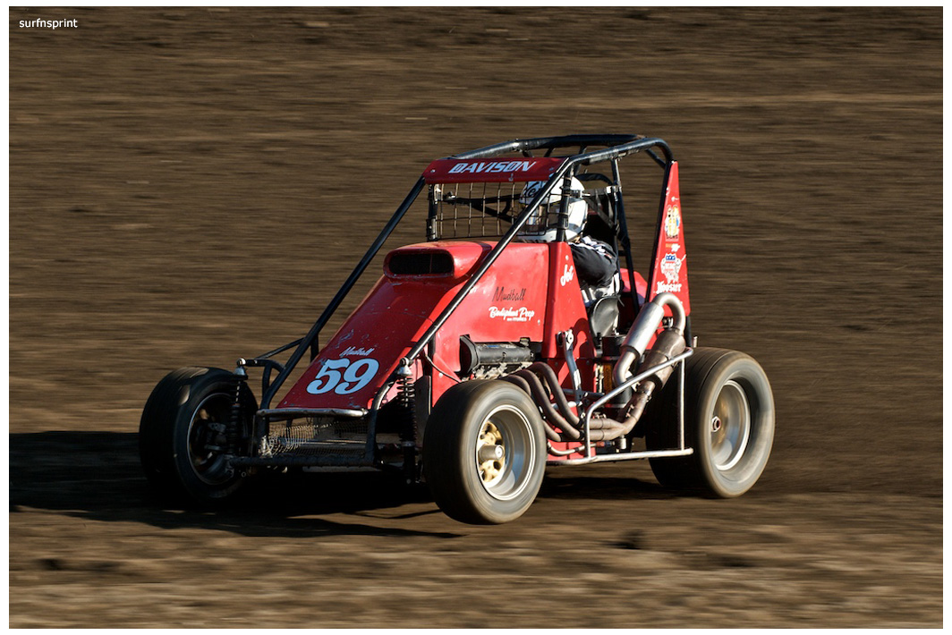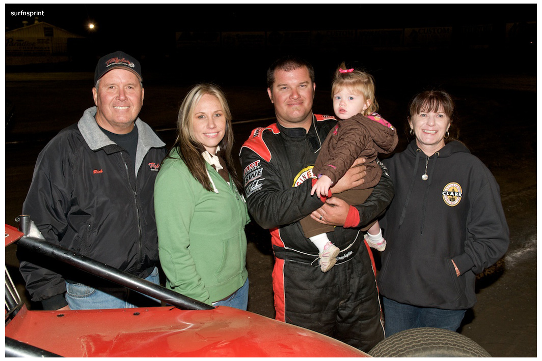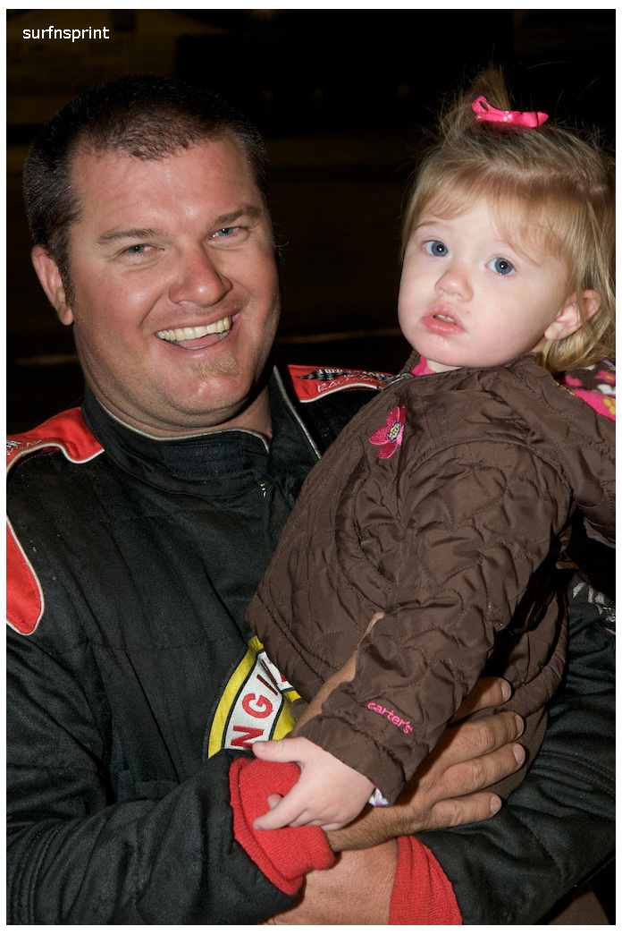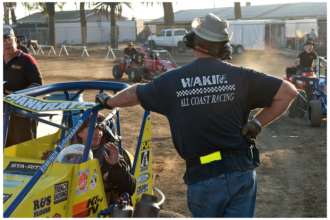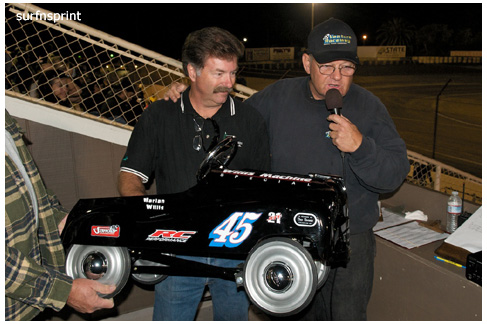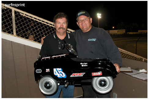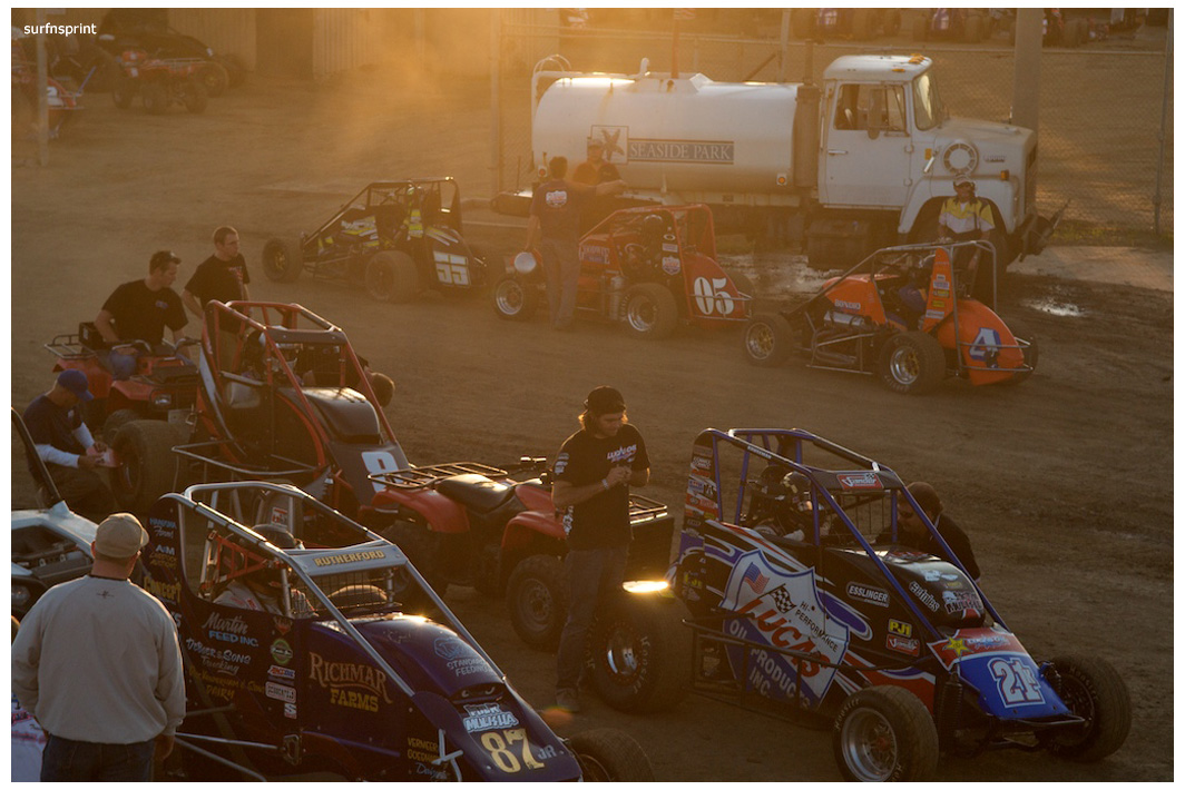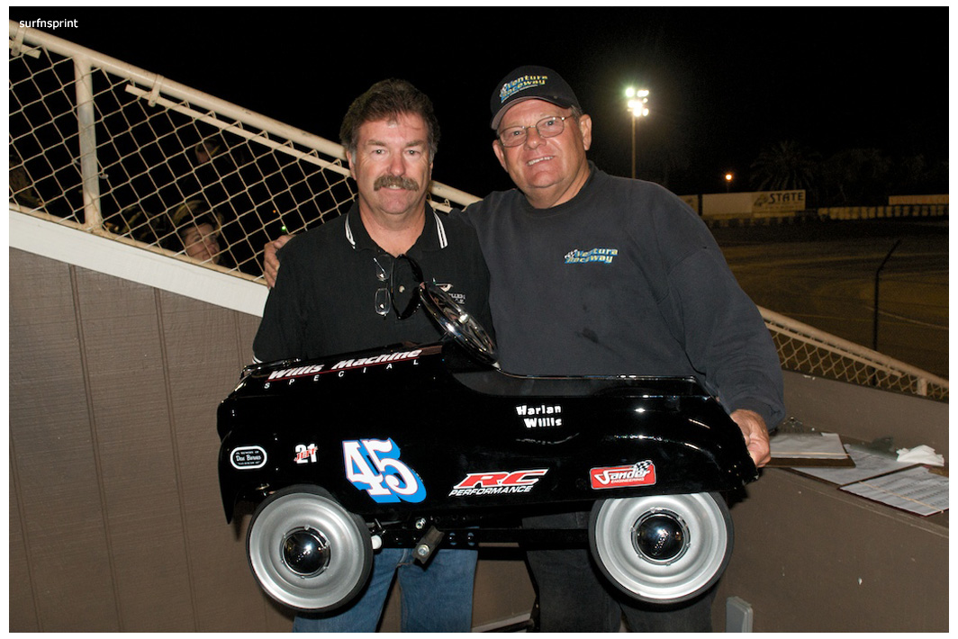 I dig the fall because it’s all about ripping sunsets, traditional races, holidays, warm homes and taking care of people you love. Without doubt the coolest scene came with Jim Naylor paying tribute to Grand Marshall Harlan Willis. Cars were in the chute were ready to launch some kind of main, but Naylor froze the track and started talking to his friend over the loudspeaker. As they talked, Harlan all soft spoken, the whole place quieted down and for the first time I can ever remember, you could have heard a pin drop in that place. A crowd of people actually gathered in front of the flag stand staring up at the announcers booth as these two longtime renegades reached deep and compared notes. Jim gave him a beautiful pedal car decorated like the famous #45 that Harlan, Cory and Nigh campaigned in. Harlan was surprised and grateful. It was one of those sincere and touching moments; kind of surreal and weird like the whole place was plugged into the same outlet and some gentle 60 watt bulb was burning on the coastal racing porch. We’re all coming home for the holidays, leave the light on.
