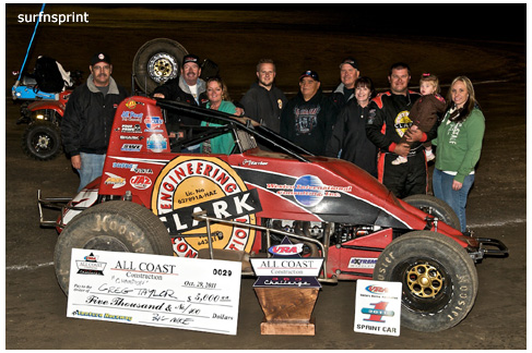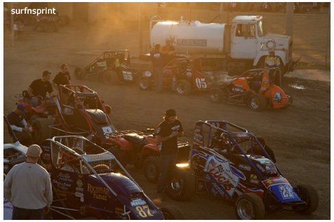 Very low key and heartfelt contest at the All Coast Challenge. Twenty four sprint cars showed up to start closing shop and putting away the tools. I remember how last year we were a little disappointed when only forty showed, what a difference a year makes. Forty would have flooded us this year. At the end of the night, I crawled out of there with some leftover t-shirts, a country western CD from David Day who was playing for the fans on the midway, 946 digital photos in the camera, program with Nic Faas on the cover, some advance copies of Norm Bogen articles with an especially intriguing Billy Albini piece, basket of cookies with a cover cloth that said thanks and signed by a hundred nut jobs, Rutherford stickers, birthday party invite from the coolest race chick, posters signed by drivers, the latest smoking hot DVD from Loudpedal Video, couple thousand memories, mud in my hair, sense of wonder and some string, not sure about that.