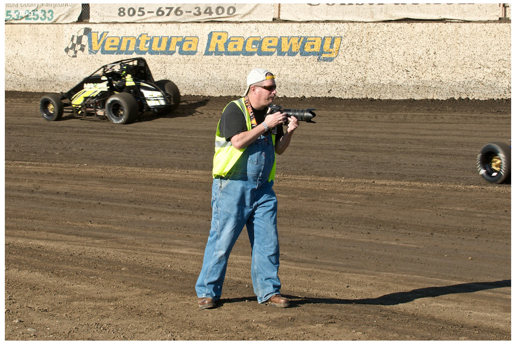 The line up is Kruseman, Camarillo, Faria, VanderWeerd and Jonathan Henry. With nineteen laps completed, Brian Camarillo has been fast all night and now he takes it to Kruseman. Immediately tries to slide him at three and four, Kruseman deftly slides under him. Right away it seems we are back in traffic and Kruseman and Camarillo are slicing with uncanny speed and daring. Brian Camarillo is ending his year with some of the most ferocious and inspired racing I have seen at Ventura ever. But that’s Obi-Wan Kenobi he is chasing and Cory is wide when he needs to be and thin through the keyholes, morphing and shifting as he chases his paycheck. Brian finally hits the back wall hard enough to lose a second (beautifully captured by Loudpedal) and Cory cashes 5K at the checkers. Greg Taylor had gamely raced from the back to tenth and barely beats Brian Camarillo for the points win and cashes his 5K. Ironically, I realized post race that had Brian passed Cory and with Greg finishing tenth, Brian would have collected the entire ten grand. After his best drive I've ever seen, he was pounding his steering wheel in frustration! Top five is Kruseman, Camarillo, Faria, VanderWeerd and Rutherford. Troy Rutherford is hard charger from 11th to fifth but unbelievably the stinking sponsor has no hard charger award in these hard times and Troy is once again spanked for greatness. It really was an awesome race. Watching from a distance, the riverboat gambler shrugs, turns and makes his way east towards Perris.