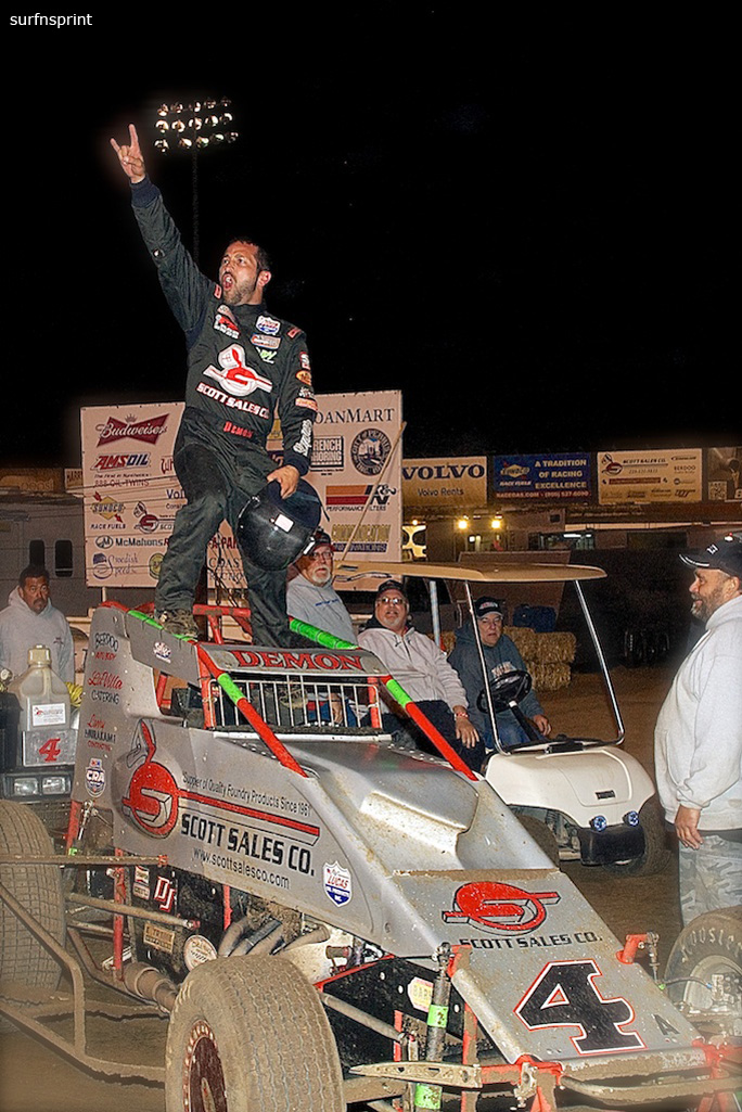 I am back in earthy Tulare, at Steve Faria's stockyard of speed, the legendary Thunder Bowl. Everybody in this glorious valley is named Faria and there's Danny Faria Jr. on the pole with Nick Faas to his outside. Nic Faas is one of what I call the "fast boys" but he knows he needs to find one more notch on that accelerator. Behind the pole sits Spencer, surprised I suspect by the second place finish he last took at Perris. No matter, the ultimate competitor. Jace VanderWeerd again starting towards the front, this time in the fourth spot. Behind him are two more of the "fast boys", Kaeding and the Demon. Kaeding is high in the points, consistent but lacking the brilliance of previous years. JMO, he is probably happy to be at a track synonymous with his family name. Next is the Demon, fresh off his smashing victory at Perris, first in points and leading in attitude for invincibility. Message board has him as a shoo-in. Further back a cattle car of talent including the Jory army, Mitchell, hot streak Ryan Bernal and that other VanderWeerd. Green and Faria fishtails Faas down the front, Faas unimpressed and takes the lead. Spencer also clocks under Faria for second. Now Bud Kaeding also clears Faria for third and here comes the Demon. It's Faas out front, Spencer, Kaeding and the Demon. Faria is all the way back to fifth, but there is no quit in that heart and he is pounding on the door. Faas and Kaeding just going at it. Kaeding takes the lead and Faas now has his hands full with Spencer. It's Kaeding riding the high line, Faas and Spencer but Spencer now makes the pass under Faas. The Demon is still back there somewhere around fourth, but then also clears Faas for third. We settle in for some high-speed laps, really hauling, but this auction is far from over. Kaeding, Spencer, Demon and Faas. Further back, Ryan Bernal is on the move and beating on fifth place Faria. Johnson spins and we are yellow. Green and five times USAC Champion Mike Spencer is making life hell for Bud Kaeding. But the real smoke is coming from Ryan Bernal who has figured out the bottom and exploded up to fourth behind Damion. He is moving so fast your eye is diverted from Kaeding and Spencer and you can't look away. Ryan Bernal, who has been on a USAC 360 winning streak is now putting the screws to the 410 fast boys. The action is shifting rapidly. Another spin, yellow and the line up is Kaeding, Spencer, Bernal, Demon, Faria and Mitchell. Green and Bernal just hits hyper speed, lifting like a freaking space shuttle. He moves Damion out of the way like a kid kicking a beach ball! I think "that's not smart" but quickly realize Damion is never going to catch him. Spencer takes down Kaeding for the lead but here comes Bernal. He passes Kaeding for second. Spencer taps the wall in turn two and Bernal blows past him also. Not since I saw Larson torture this track in 2012 have I seen such a dominating performance. Bernal just nuclear going into the corners and scorching the straightaways. There is still a race behind him but who could take their eyes off this spectacle? Two laps to go, Bernal loses his brakes and moves up the track out of the way. This kid has matured a lot. Spencer's brakes are fine (Broom) and seizes the moment like the Champion he is. Spencer first, Bernal second and Faria third with his new crew chief Vinnie!