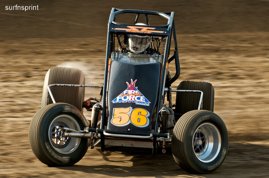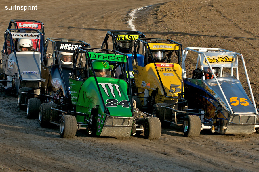 I was in the backfield watching the kids leaving the track. That’s a steep incline on the exit ramp and it was beautiful watching those little mini dwarf putt putts struggle up that hill to get back to the pits, children barely peering over the hood just trying to get home. Lots of controversy always with the kid classes, parents protective like they should be, officials wanting to be fair. Hope everybody works it out. Logan Rutherford beat back a determined Destyn Garcia. Lauren Velasquez of the famous Velasquez Racing Family in third. As good as any sprint car race I’ve ever seen. Joe Snyder took down Miles Hedrick in the hotly contested Supercharger event. I’m not sure about that pass down the back, but I respect anyone pushing the envelope! You’ll have to check it out for yourself at surfnprint.com. Tommy Velasquez of the famous Velasquez Racing Family in third. Junior Midgets were a riot with Brennan Rogers waving “see ya” as he passed hard charging Austin Figueroa. Ever-faster Cody Majors in third.