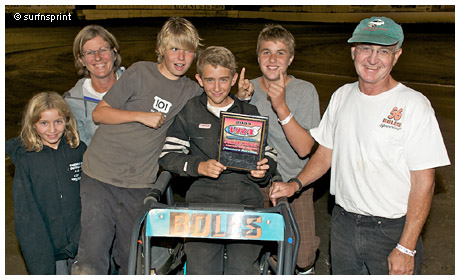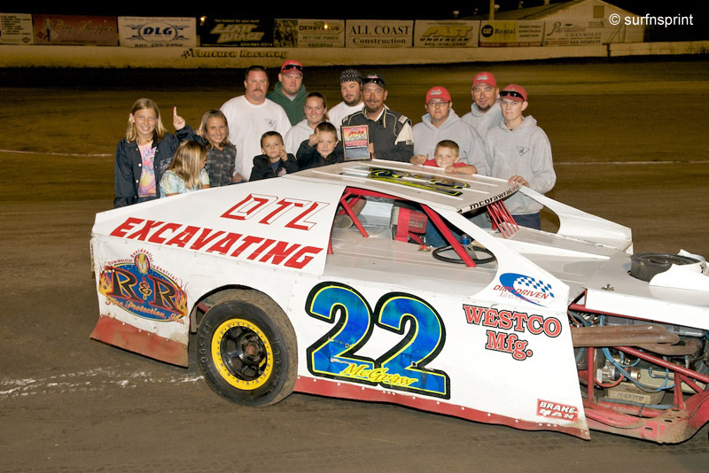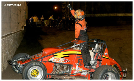 They need to focus that Hubble telescope on this track. It might be the only camera big enough to capture all the greatness here. This VRA Sprint Main is loaded front, back and middle. Kierce and Crawford pack the front row; Brian Camarillo and Hendrix are taking care of business in the back. You have center cuts like Greg Taylor and Troy Rutherford. Insanely talented drivers like Espinoza, Woodward, Mero, Wakim and Conrad are liberally sprinkled throughout. Track sweet as rhubarb pie. Scotty cackles on the radio "line up is good". Phillip Stevenson taps his foot and holds out his flag one to go. Jeff Kristensen and I are in the tower and we can almost see the end of summer. The entire grandstand draws one long breath holds it and then all hell breaks loose. Crawford and Kierce hit the gas and it is Crawford through the mouse hole. He was actually looking good but got loose on the second lap and fumbled all through turn two. You can beat Kevin Kierce but you can't make any mistakes. Kierce takes over but he's picked up a little shadow called Cody Kershaw. Kershaw has been suffering through a mid season slump and he was determined this race was going to be redemption. Another Ventura brat with no fear and the ability to back it up! John Nock and Cory Kruseman were also right there, scrambling for position. Kierce, Kershaw, Kruseman and Ronnie Case all banking high, Nock and Rutherford are grinding the bottom, Rutherford never left it the rest of the race. Cody Kershaw is filled with a will to lead and is smothering Kierce. He tries a massive slide job out of one and it nearly works. Kierce appears startled by the audacity and brakes hard. Everybody behind him scatters. Kierce has massive acceleration down the back and wicked into three and four. He beats Cody to the flag stand and clutches the lead to his chest. Kruseman is third behind Kershaw and also appears flummoxed by this young kid's spunk. He is looking for an opening but Cody shuts every crack. The entire crowd is watching this kid cocked between seasoned champions Kierce and Kruseman and we are thrilled. You can almost see Kierce's brain spinning as fast as his tires, he is the Calculator and he is all in. He is on the top but clearly mixing it up to stymie stalking assassins. Kruseman is the litmus test at Ventura (or just about anywhere). That's not to say he always wins, but if he is on your ass and can't pass, there's about a thousand drivers that will tell you you're doing pretty good. Again Cody is blistering in three and four; again Kierce gets the text, hangs up the cell phone and gets back on the gas. Further back I see spectacular racing between Taylor and Rutherford, I'm sure there were many others, who can take their eyes off the front? Now the leaders are in traffic and Cody and Cory get a whiff of opportunity. Kierce is like quicksilver through the pack. It's the three amigos, Kierce, Kershaw, and Kruseman with Rutherford in fourth and Taylor in fifth when Guy Woodward spins in turn three. We have twenty-one laps completed with nine to go. Phillip flips the flag and the chase is back on. Cody tries another slider and is completely rejected. They are nearly in a dead heat but Kevin won't give up that lead. Hobie Conway spins and gathers Case. We have completed twenty-six laps with four to go. It's Kierce, Kershaw, Kruseman, Taylor and Rutherford. They all go high on the flag except Rutherford who is setting backfires all along the bottom. Four laps and Rutherford is clipping one car per lap. He is past Taylor, smokes Kruseman and is bearing down on Kershaw. White flag is out and the audience is in rapture. The Four Horsemen of the Apocalypse (Kierce, Kershaw, Rutherford and Kruseman) gallop thru turn four and head for the checkers. Rutherford hits overdrive and in the last ten yards he passes Kershaw for second, but Kevin Kierce is starting his victory lap. Cody Kershaw really brilliant in third. Track legend Kruseman is fourth and amazing Steve Conrad in fifth, most passes with twelve positions gained. The audience stumbles home ranting, raving and mumbling. Kevin Kierce continues to take down all comers, doesn't matter if you're a rookie, USAC champion or a supermodel.