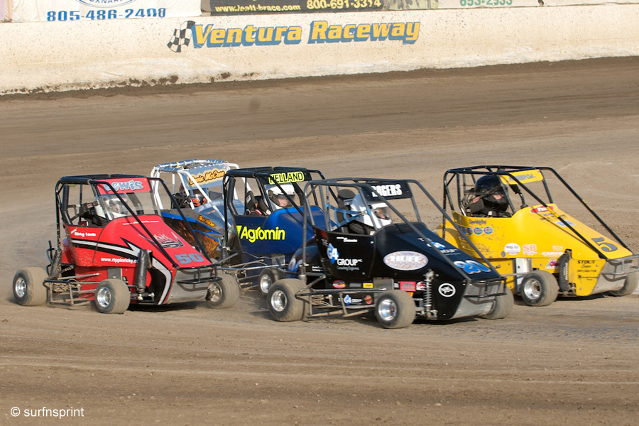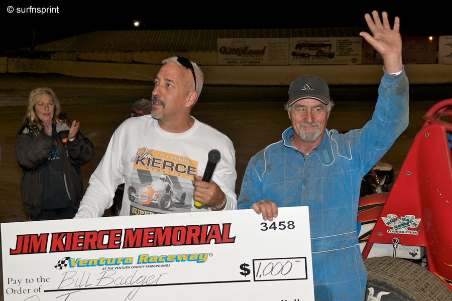 I find memorial races bring out the best our sport has to offer. They are like cake on birthdays, special events that honor glory days and special people. Kevin Kierce is about as sentimental a person as you are going to find. His passion for racing came from his father and you can see an instant replay in the current relationship with his son Justin (probably the most improved racer at Ventura barring maybe Cliff Warren). Kevin hosted the Third Annual Jim Kierce Memorial last weekend and it’s a keeper. It’s limited to the hard luck racers out of the VRA Senior Sprints. He takes the back half of the division and sets up cash winnings. When I talked to him about it, he only wanted to spotlight the sponsors. Brudda Brett’s parents, Phil and Sarah Taylor, are his biggest patrons. You can’t find nicer people. Track legend Bruce Douglas has his back. Bill Camarillo and Agromin are constantly in the background with a helping hand for so many people. I’m proud to say All Coast Construction chipped in. George Sack got Kevin in a headlock and made him take some money. Kevin also wants to thank the incredible staff at Ventura Raceway and especially Jim Naylor for helping keep his father’s spirit up front. Several thousand dollars was raised and is being distributed as the final t-shirt sales roll in. Oh yeah, Kevin really wants to thank the young and generous Lauren Shields who donated her summer earnings. Constant presence and low-key racer Bill Badger drove a beautiful race to take home a thousand dollars. Cool Race Chick turned to me in the tower and said “perfect”.