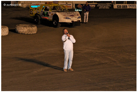 Right before the Main Event, Eddie Stanfield got up front and did something he’s never done before. He decides that to honor his dad he is going to sing “God Bless America” in front of the grandstands. His father was a war veteran, hard worker, family man and inveterate racer, crew chief, sponsor and fan who helped many at the raceway. That’s a precious combination. He was killed by an out of control sprinter as he watched a race from the infield. With his brother Allen and his mother in the stands, Eddie steps up and pours his heart into it. Really beautiful version, which was warmly received by the crowd. What a tribute for your dad. Twenty-four years of honor. He was really singing God Bless Bud Stanfield.