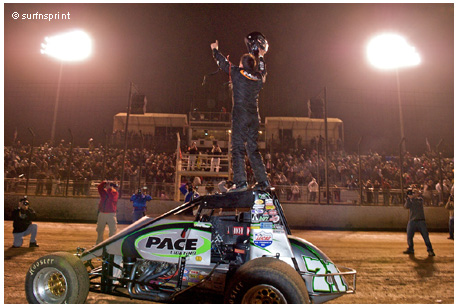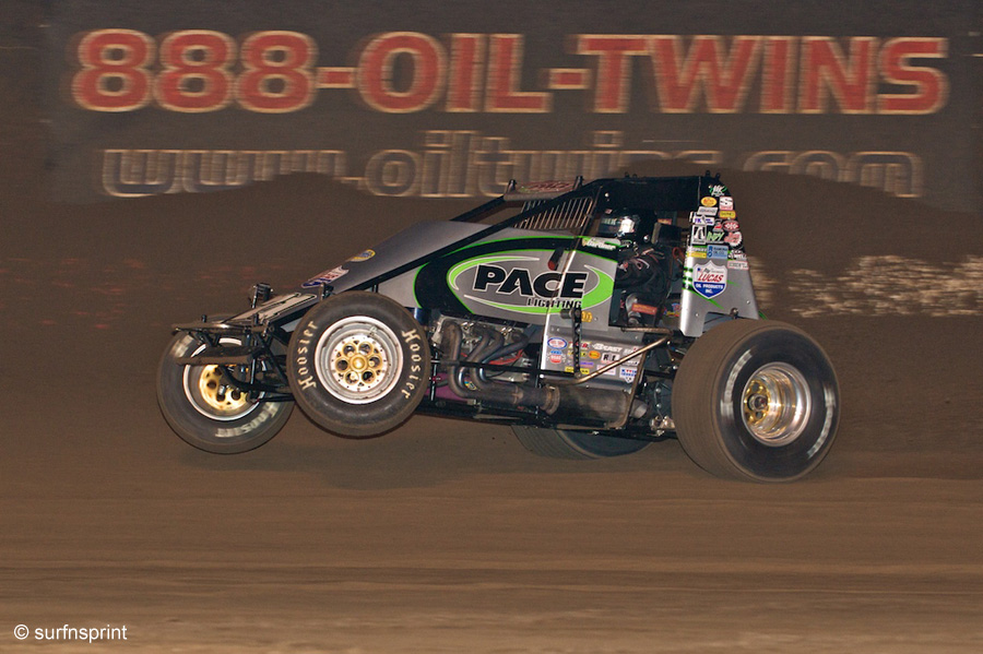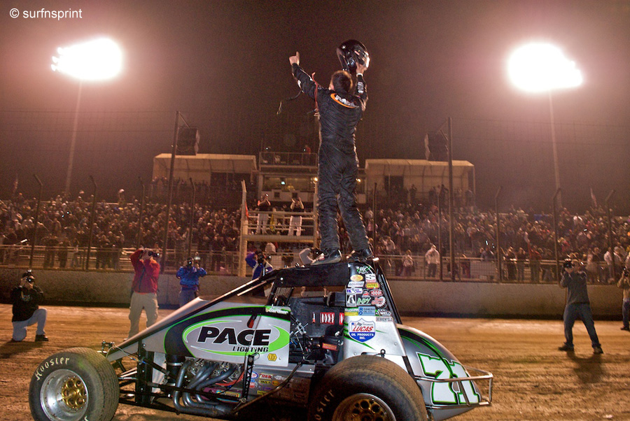 Friday night qualifying was John Stanbrough, again, with a sizzling 16.303. Nice to see Nic Faas in second. This kid is off the hook. Another round of C Main, five heats, B main and feature. But tonight was going to be different. Solberg took the C Main followed by Cody Williams, John Aden and late entry Rusty Carlile. Heat winners were Rip Williams, Kevin Swindell, David Cardey (barely besting red hot rookie Brent Camarillo), Tony Jones, and Matt Mitchell (in a tumultuous heat that had Dave Darland upside down). The B main brought Stanbrough, Faas, Clauson and Jimmy Crawford back into focus. Ironically, the top three finishers in the B main were the top three fast times in the same order. The track was perfect, the stars were aligned and this Main Event was going off the rails. Classic slugfest with Levi Jones, Jon Stanbrough, Mike Spencer and Damion Gardner all finding their way to the front. What a fight! Jones was strong, Stanbrough was unrelenting and Spencer looked so very comfortable with the Indiana boys. But it was Damion who really brought the fight to this race. Gaining on front-runner Jones, he started issuing a series of slides and dicing that had the spectators on the edge of their seats. The unbelievable slide jobs by both Gardener and Jones in four followed by precision high speed jockeying down the front straight away was the most beautiful racing I've ever seen. The Snowman was stalking. They were in heavy traffic and nobody lifted. Damion took the lead for one lap but Jones regained control. A lapped car tapped the Demon in turn one and it seemed to take the edge off of his attack. Jones was out front, Stanbrough in second, an incredible Mike Spencer moved into third and the dark prince of open wheel racing settled regretfully for fourth. From the pits to the tower and every faraway place where computer screens were streaming, everyone finally breathed again. Epic. Check out Dean Mills and Raceway Video. These are the races we live for.
