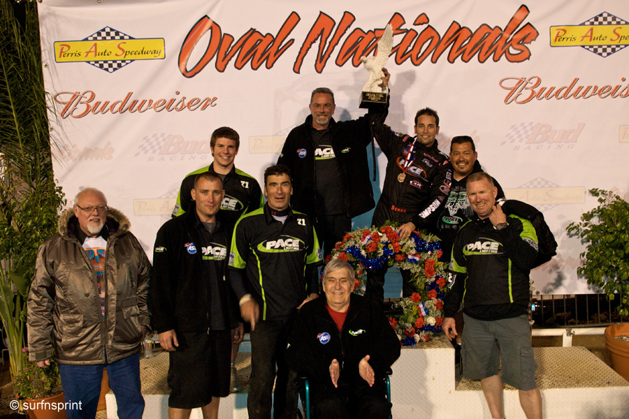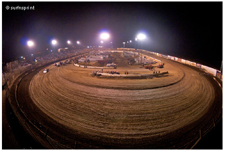 Saturday Night Main Event. Fat lopey grinning moon in the sky. Hall of Fame Rip Williams is on the pole and Austin Williams is on the last row. That's going to be some interesting life long invert. Rip leads the pack into turn one and we are a thundering herd. Rip showed no weakness; Damion Gardner was hot in second and again racing the Snowman. Spencer third and we started cycling through a series of reds. Darren Hagen flipped on lap five. Strongman Stanbrough hit the wall and left the track on a yellow. Cruel sport for the fastest car. Tracy Hines flipped on lap ten. Whitt flipped on eleven. Spencer passes Gardner on a bobble for the second spot. Then he passes Williams for the lead. Clauson moves to second. Damion Gardner was third and it looked like he was fighting with a tight car. His crew was all over it and slowly bringing it in. Levi Jones passed the Ripper for fourth. Swindell flipped lap 29 and lastly Cardey hooked and went over about lap thirty-two. The Demon knew it was now or never. He told reporter Richard Manfredi " Every time I looked forward, I saw a guy I didn't want to win." The Snowman. He blows past Clauson. He passes Spencer on the top for the lead but a yellow reeled him back in. On the restart he went to the top again but it wasn't getting it done. The great Mike Spencer was precise as an engineer and holding. With three laps to go, Spencer is high in four, The Demon comes in with a low slider in turn four and takes the lead. He starts to pull away, the ice starts to melt and we all now know the 2009 Oval Nationals Champion.